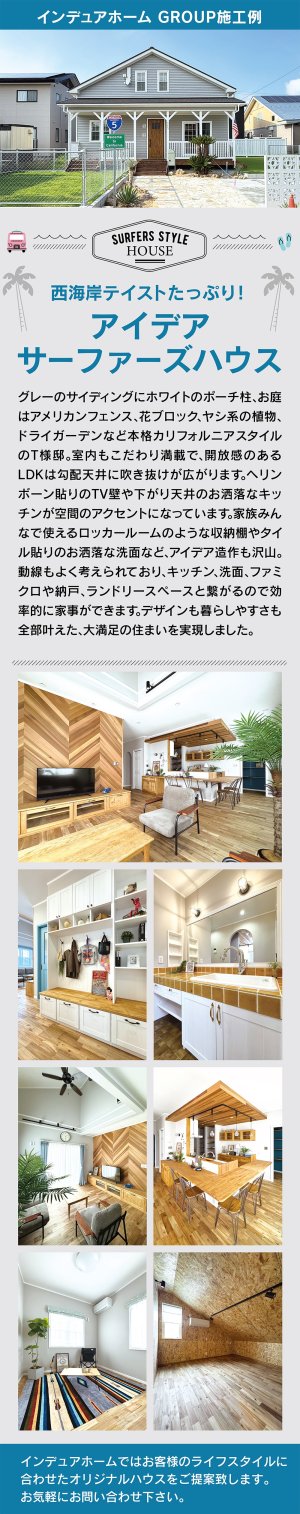 本格カリフォルニアスタイルのT様邸。グレー外壁×ホワイト柱にヤシやドライガーデンの庭。吹き抜けLDKやヘリンボーン壁、造作収納と効率的な動線でデザインも快適性も実現。